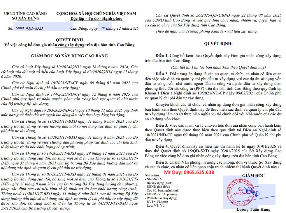 Đơn giá nhân công tỉnh Cao Bằng năm 2026 Quyết định 5889/QĐ-SXD