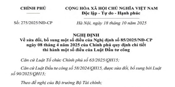 Nghị định 275/2025/NĐ-CP Chính phủ về sửa đổi, bổ sung một số điều của Nghị định số 85/2025/NĐ-CP ngày 8/4/2025 của Chính phủ quy định chi tiết thi hành một số điều của Luật đầu tư công Nghị định...