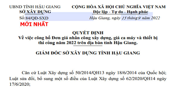 Ngày 15 tháng 9 năm 2022 Sở xây dựng Hậu Giang công bố đơn giá nhân công Quyết định 84/QĐ-SXD. Thay thế Đơn giá nhân công xây dựng tỉnh Hậu Giang quý 3 năm 2021 ban hành theo Quyết...