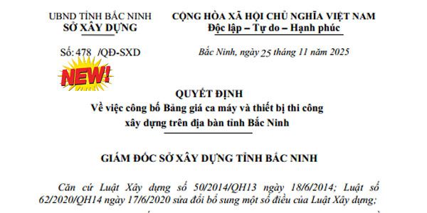 Quyết định 478/QĐ-SXD Bảng giá ca máy tỉnh Bắc Ninh năm 2026 . Sở Xây dựng ban hành ngày 25/11/2025 làm cơ sở căn cứ lập dự toán xây dựng công trình trên địa bàn tỉnh Bắc Ninh Bảng...